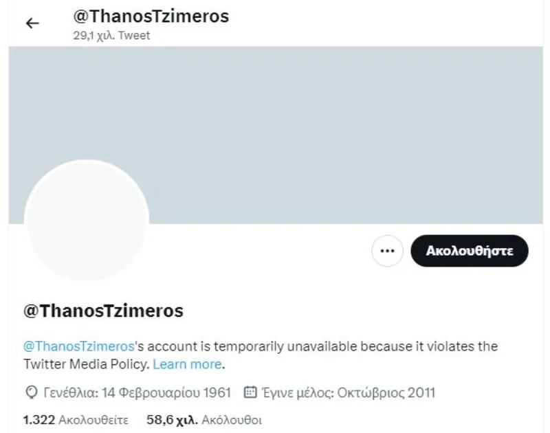 Παρελθόν από το Twitter αποτελεί ο Θάνος Τζήμερος, καθώς η δημοφιλής πλατφόρμα κοινωνικής δικτύωσης απέκλεισε τον λογαριασμό του.