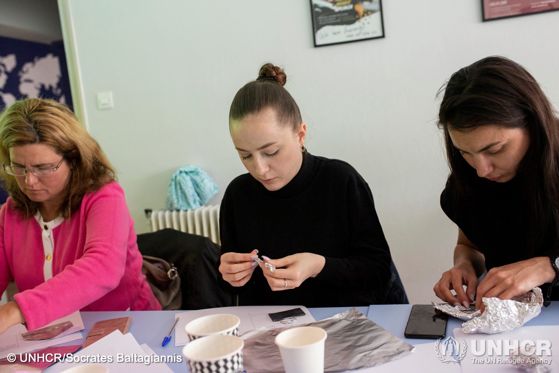 Η Katerina* κάθεται γύρω από ένα τραπέζι μαζί με άλλες Ουκρανές γυναίκες και χρησιμοποιούν αλουμινόχαρτο για να φτιάξουν αντικείμενα που έχουν ξεχωριστή σημασία για εκείνες. Οι γυναίκες, που μοιράζονται το κοινό βίωμα της προσφυγιάς, καλούνται να εκφράσουν τα συναισθήματα και τις ανάγκες τους μέσα από ένα εργαστήρι art therapy που διοργανώνεται στο Κέντρο Ψυχοκοινωνικής Υποστήριξης Προσφύγων, στην Αθήνα. Το εργαστήρι αποτελεί μέρος ενός ευρύτερου προγράμματος ψυχοκοινωνικής υποστήριξης Ουκρανών προσφύγων, που υλοποιείται από την Εταιρεία Περιφερειακής Ανάπτυξης και Ψυχικής Υγείας (ΕΠΑΨΥ) σε συνεργασία με την Ύπατη Αρμοστεία του ΟΗΕ για τους Πρόσφυγες.