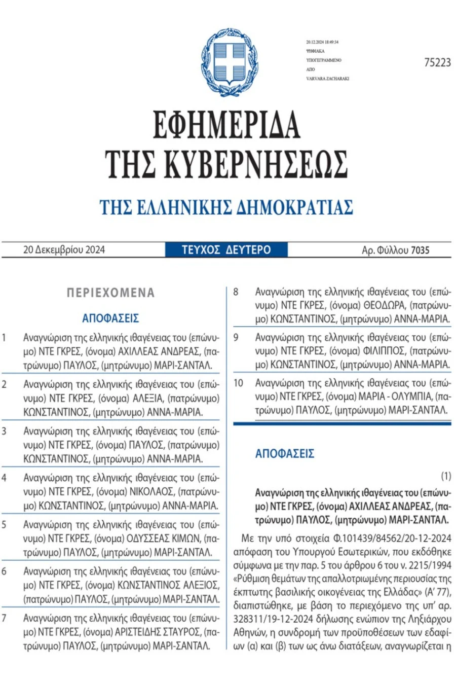 Σήμερα το απόγευμα δημοσιεύθηκε στην Εφημερίδα της Κυβερνήσεως η απόφαση του υπουργού Εσωτερικών, Θοδωρή Λιβάνιου, που αφορά την αναγνώριση της ελληνικής ιθαγένειας για τα μέλη της βασιλικής οικογένειας «Ντε Γκρες».