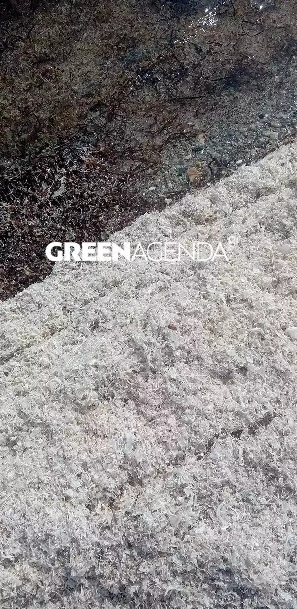 Η αποσυντεθειμένη οργανική μάζα που κατέληξε τις τελευταίες ημέρες στον Κόλπο της Κριθαροπούλας έχει δημιουργήσει ένα πυκνό στρώμα αγκαθιών που καθιστά το περπάτημα χωρίς παπούτσια, αδύνατο, σύμφωνα με το greenagenda.