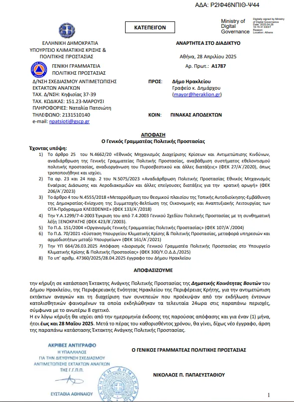 Συγκεκριμένα η απόφαση αναφέρει: «Αποφασίζουμε την κήρυξη σε κατάσταση Έκτακτης Ανάγκης Πολιτικής Προστασίας της Δημοτικής Κοινότητας Βουτών του Δήμου Ηρακλείου, της Περιφερειακής Ενότητας Ηρακλείου της Περιφέρειας Κρήτης, για την αντιμετώπιση εκτάκτων αναγκών και τη διαχείριση των συνεπειών που προέκυψαν από την εκδήλωση έντονων κατολισθητικών φαινομένων τα οποία εκδηλώθηκαν τα τελευταία 24ωρα στις παραπάνω περιοχές.