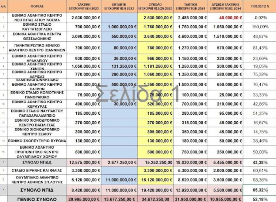 Συγκεκριμένα, τα 17 ΕΑΚ ανά την επικράτεια, η «καρδιά του ελληνικού αθλητισμού», επιχορηγούνται πλέον με 31,95 εκατ. ευρώ, έναντι 20,995 εκατ. ευρώ το 2023, ήτοι με 10,955 εκατ. ευρώ περισσότερα!