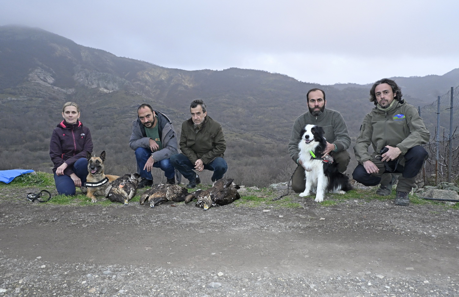 - Το κλιμάκιο της έρευνας. Στα δεξιά ο ειδικά εκπαιδευμένος σκύλος της ΕΜΑΔΔ του ΟΦΥΠΕΚΑ, Λάικα, και στα αριστερά ο σκύλος της ΕΜΑΔΔ της Εταιρείας Προστασία Βιοποικιλότητας της Θράκης, Ντάλτον ©Λαυρέντης Σιδηρόπουλος