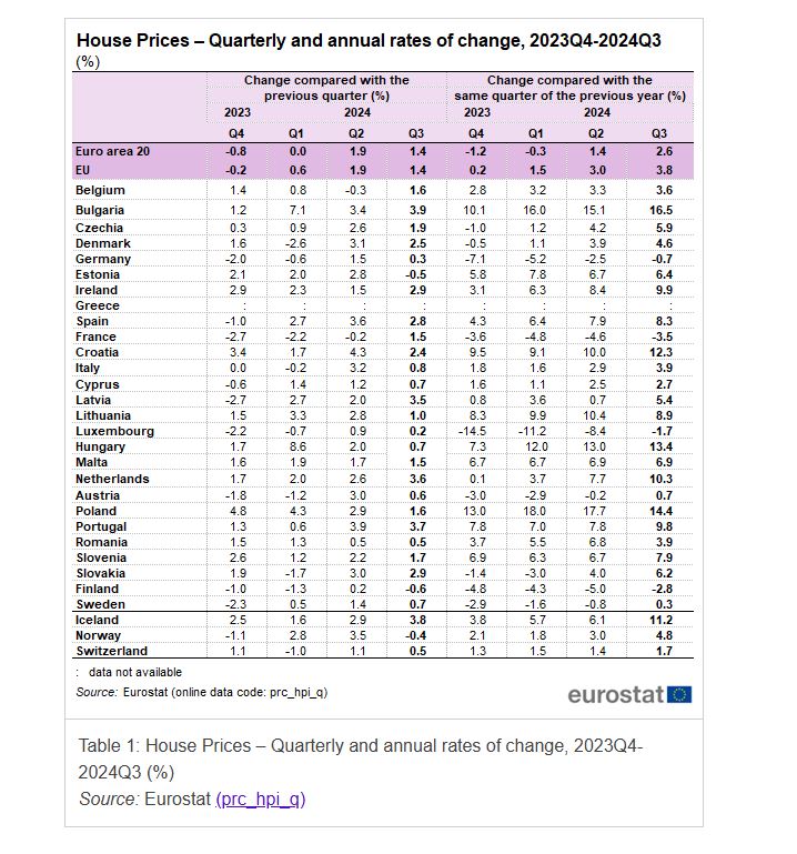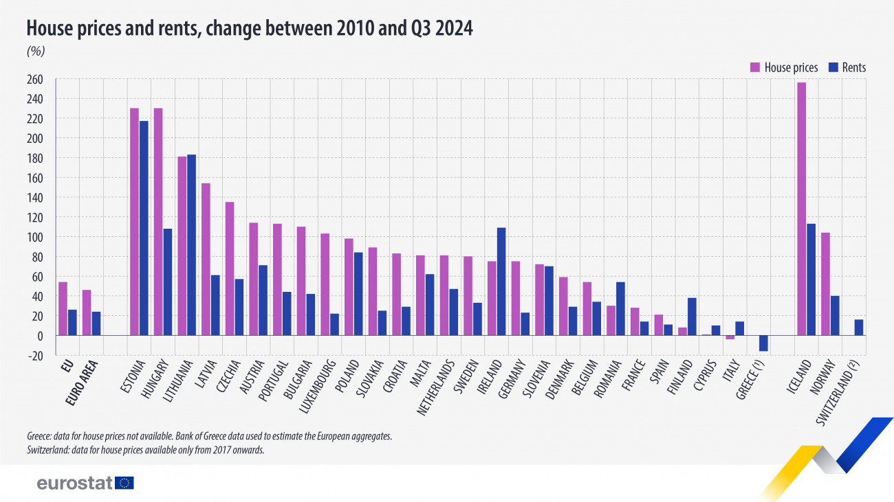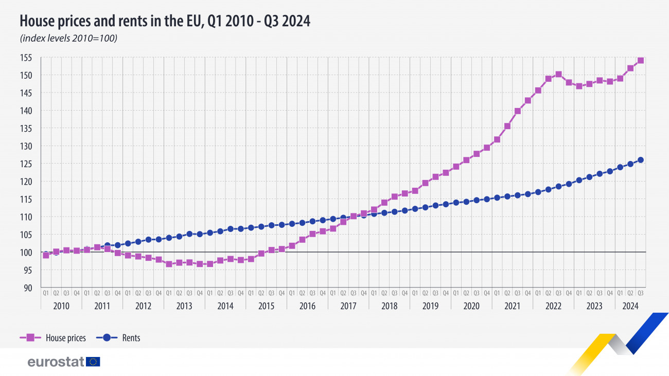 Σύμφωνα με την Eurostat, το τρίτο τρίμηνο του 2024, οι τιμές των κατοικιών στην ΕΕ αυξήθηκαν κατά 3,8%, ενώ τα ενοίκια αυξήθηκαν κατά 3,2% σε σύγκριση με το τρίτο τρίμηνο του 2023.