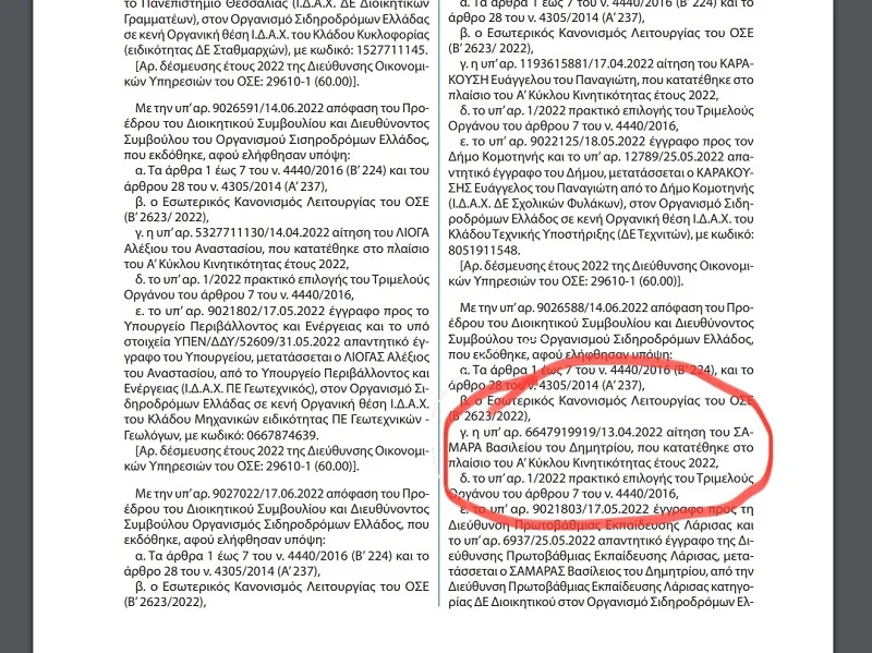ε. το υπ’ αρ. 9021803/17.05.2022 έγγραφο προς τη Διεύθυνση Πρωτοβάθμιας Εκπαίδευσης Λάρισας και το υπ’ αρ. 6937/25.05.2022 απαντητικό έγγραφο της Διεύθυνσης Πρωτοβάθμιας Εκπαίδευσης Λάρισας, μετατάσσεται ο ΣΑΜΑΡΑΣ Βασίλειος του Δημητρίου, από την Διεύθυνση Πρωτοβάθμιας Εκπαίδευσης Λάρισας κατηγορίας ΔΕ Διοικητικού στον Οργανισμό Σιδηροδρόμων Ελλάδας σε κενή Οργανική θέση του Κλάδου Κυκλοφορίας (ειδικότητας ΔΕ Σταθμαρχών), με κωδικό: 1645713805. [Αρ. δέσμευσης έτους 2022 της Διεύθυνσης Οικονομικών Υπηρεσιών του ΟΣΕ: 29610-1 (60.00)».