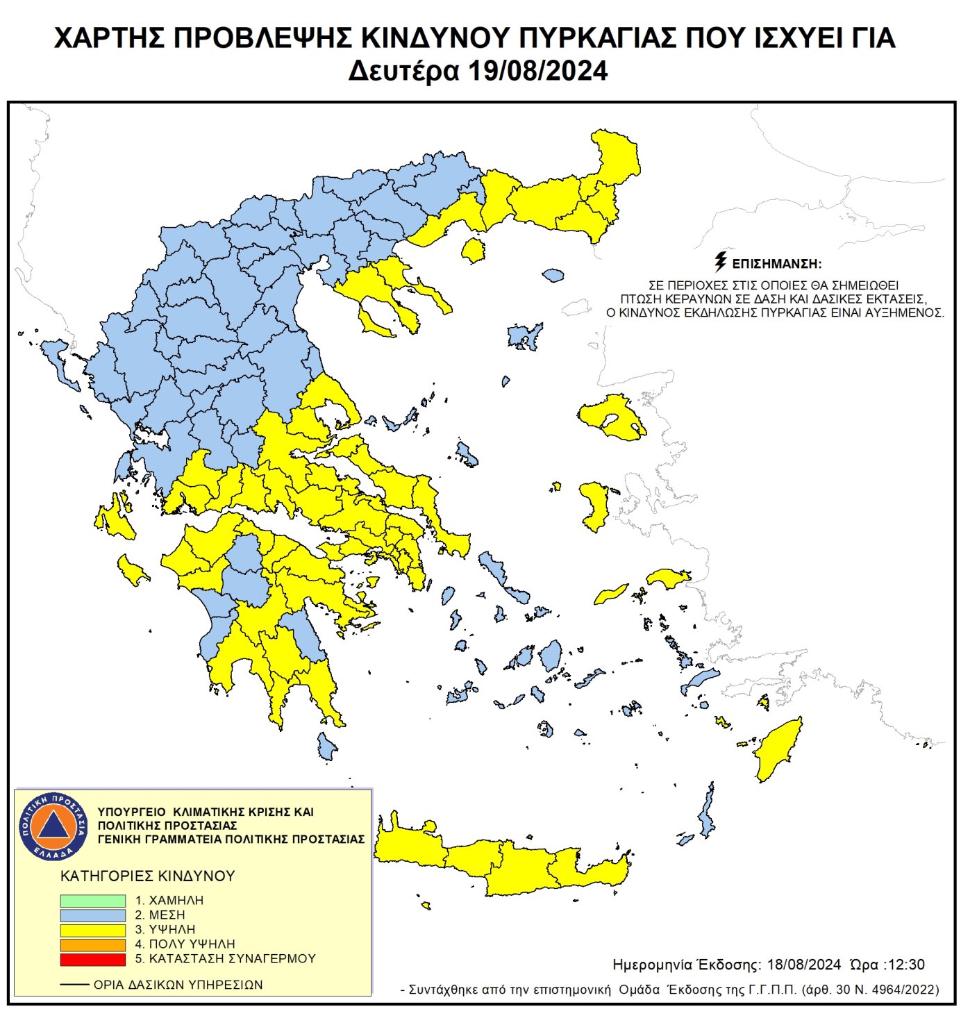 Πιο συγκεκριμένα, όπως καταγράφεται στον ημερήσιο χάρτη πρόβλεψης κινδύνου πυρκαγιάς, τον οποίο εκδίδει η Γενική Γραμματεία Πολιτικής Προστασίας του υπουργείου Κλιματικής Κρίσης και Πολιτικής Προστασίας, υψηλός είναι ο κίνδυνος εκδήλωσης πυρκαγιάς στη Χαλκιδική και σε άλλες περιφέρειες της χώρας, όπως η Κρήτη, η Θράκη, περιοχές της Πελοποννήσου, της Στερεάς Ελλάδας και σε νησιά του Αιγαίου.