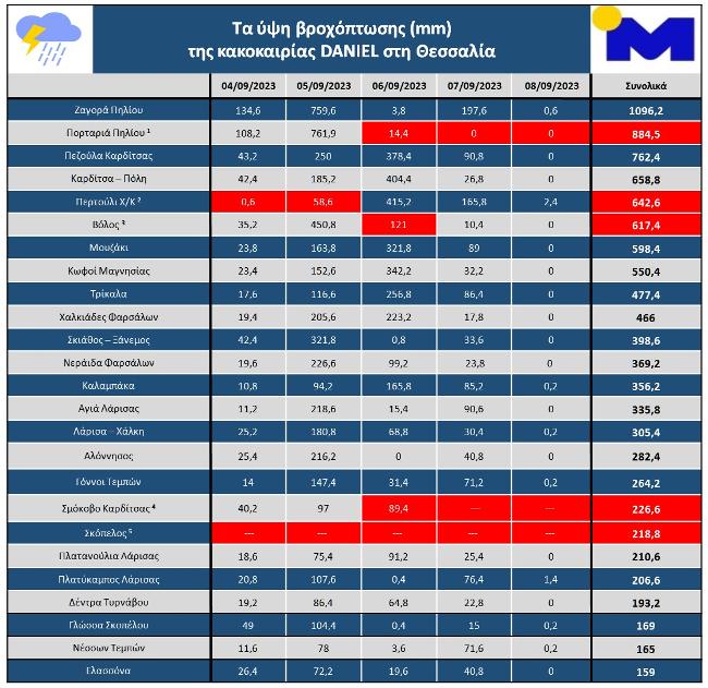 Τα ημερήσια και αθροιστικά ύψη βροχόπτωσης της κακοκαιρίας Daniel στη Θεσσαλία παρουσιάζει το Εθνικό Αστεροσκοπείο Αθηνών/meteo.gr σε σχετικό πίνακα.