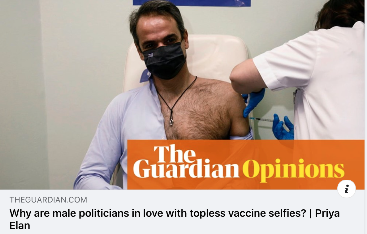 Την τιμητική του έχει ο Κ. Μητσοτάκης όπως και ο συντηρητικός Johnny Mercer και ο Γάλλος Olivier Véran που φωτογραφήθηκαν ημίγυμνοι κατά την ώρα του εμβολιασμού τους. To άρθρο που υπογράφει ο Priya Elan, fashion editor της εφημερίδας. Απαραίτητο για τη σέλφι του εμβολιασμού λέει το ανοιχτό πουκάμισο, το στήθος Βίκινγκ και το παίξιμο στο μάτι…