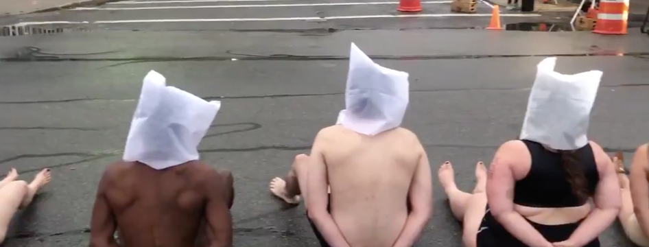 BREAKING: A group of demonstrators are standing naked with spit hoods over their heads in front of the Public Safety Building as a way to demand state action for the death of #DanielPrude. @news10nbc