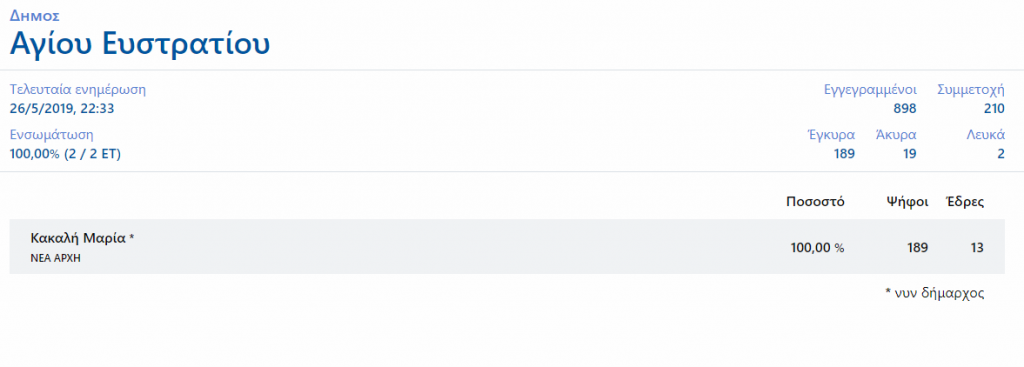Η Μαρία Κακαλή συγκέντρωσε το 100% και 13 έδρες στον δήμο Αγίου Ευστρατίου στη Λήμνο σύμφωνα με τα επίσημα αποτελέσματα των εκλογών.
