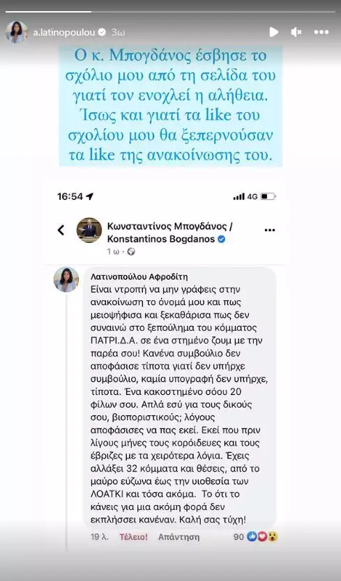 Την απάντησή της με όλες αυτές τις καταγγελίες, η Αφροδίτη Λατινοπούλου την ανέβασε στη σελίδα του Κωνσταντίνου Μπογδάνου, όπου έμεινε για κάποια ώρα πριν ο κ. Μπογδάνος την κατεβάσει. Έτσι η κα. Λατινοπούλου επανήλθε σχολιάζοντας πως «ο κ. Μπογδάνος έσβησε το σχόλιο διότι τον ενοχλεί η αλήθεια, ίσως και γιατί τα like του σχολίου μου θα ξεπερνούσαν τα like της ανακοίνωσής του».