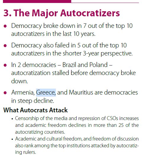 Σε ότι αφορά την Ελλάδα, όπου γίνεται ειδική αναφορά, η παρακμή χαρακτηρίζεται από τη σταδιακή υποβάθμιση των θεσμικών ελέγχων και ισορροπιών που αποτελούν τον πυρήνα της αρχής της φιλελεύθερης δημοκρατίας και διασφαλίζουν τον περιορισμό της εκτελεστικής εξουσίας.