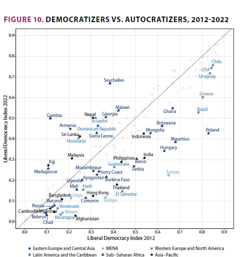 Στην Έκθεση παρουσιάζονται οι 10 κορυφαίοι δείκτες μείωσης των δεικτών «Φιλελεύθερη Δημοκρατία και διαβουλευτική συνιστώσα» μεταξύ 2017 και 2022.