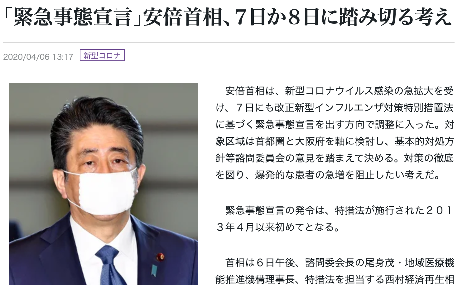 Βάσει νόμου που αναθεωρήθηκε τον Μάρτιο ώστε να συμπεριλάβει την πανδημία του κορωνοϊού, ο πρωθυπουργός μπορεί να κηρύξει κατάσταση έκτακτης αν μια ασθένεια εγείρει «σοβαρό κίνδυνο» για τη ζωή των πολιτών και μπορεί να έχει σοβαρό αντίκτυπο στην οικονομία. Η πανδημία πιστεύεται ότι ήδη μεγέθυνε τον κίνδυνο η Ιαπωνία να ολισθήσει σε ύφεση.