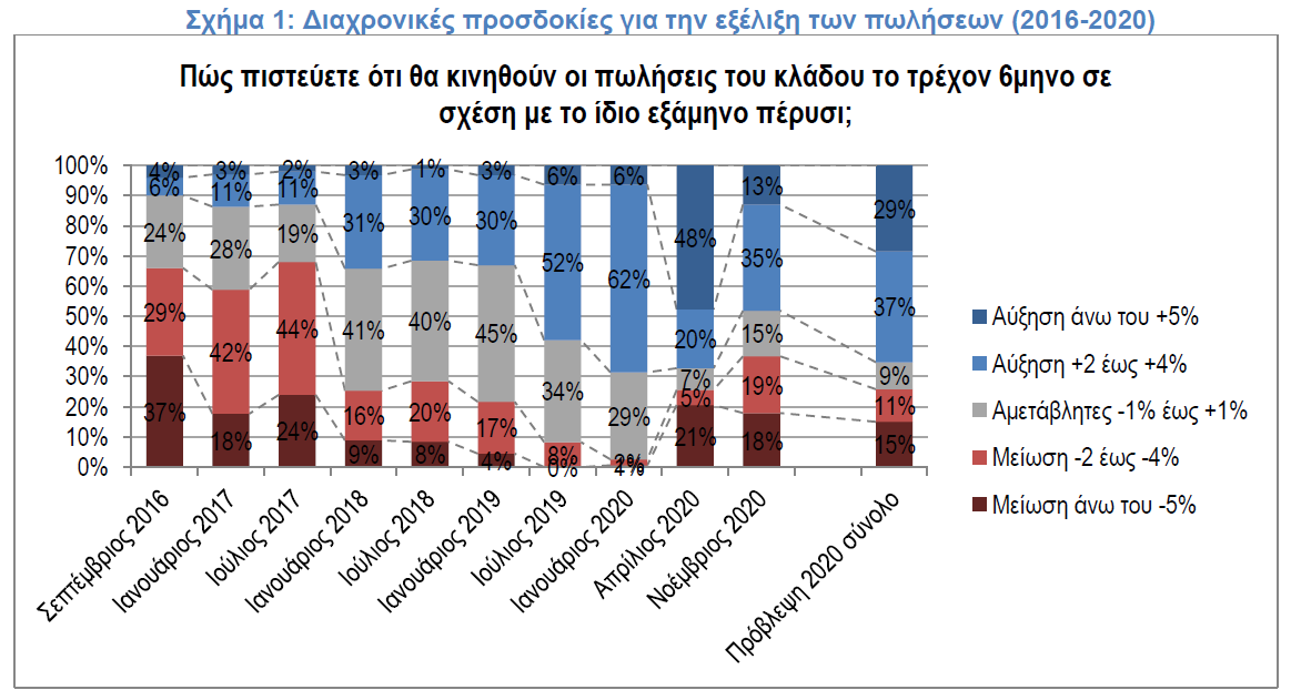 Σε σχέση με τις προσδοκίες για τις πωλήσεις του κλάδου (βλ. σχήμα 1), καταγράφεται μεγάλο ποσοστό ερωτηθέντων 48% οι οποίοι θεωρούν ότι οι πωλήσεις του κλάδου θα αυξηθούν το τρέχων εξάμηνο και μεγάλο ποσοστό οι οποίοι θεωρούν ότι θα παρουσιάσουν μείωση 37%. Μεσοσταθμικά τα στελέχη που συμμετείχαν στην έρευνα εκτιμούν ότι θα καταγραφεί αύξηση της τάξης του 0,2% στις πωλήσεις το εξάμηνο Ιούλιος 2020-Δεκέμβριος 2020 σε σχέση με το ίδιο εξάμηνο του 2019, ενώ για το σύνολο του έτους 2020 εκτιμούν αύξηση πωλήσεων της τάξης του 1,6% μεσοσταθμικά. Η εξέλιξη αυτή σε μεγάλο βαθμό αποδίδεται στα μέτρα για τον περιορισμό της εξάπλωσης του κορωνοϊού, το κλείσιμο της εστίασης και την παραμονή των πολιτών στα σπίτια. Βέβαια οι πωλήσεις στο λιανεμπόριο τροφίμων σχετίζονται άμεσα με την ψυχολογία των καταναλωτών και την ευρύτερη οικονομική και κοινωνική κατάσταση και λοιπές εξελίξεις να επιδράσουν σε αυτή την πρόβλεψη, ειδικά στην αγορά των εορτών.