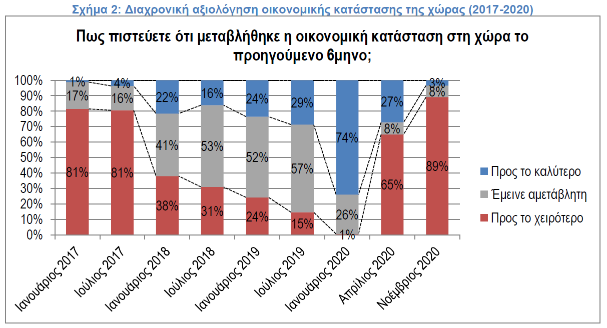 Η θετική τάση που καταγράφηκε στην αποτίμηση της εξέλιξης της οικονομικής κατάστασης της χώρας το 2019 παρουσιάζει πλήρη αναστροφή και σε αυτή τη μέτρηση. Συγκεκριμένα, ενώ τον Ιανουάριο 2020 η πλειοψηφία σε ποσοστό 74% θεωρούσε ότι η οικονομική κατάσταση βελτιώθηκε και το 1% ότι χειροτέρεψε, 10 μήνες μετά το 3% θεωρεί ότι η οικονομική κατάσταση βελτιώθηκε και το 89% ότι χειροτέρεψε. Αντίστοιχα ποσοστά είχαν να καταγραφούν από τον Ιούλιο του 2017.