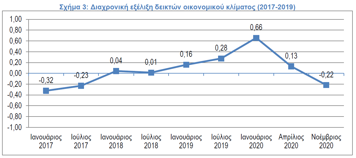 Το οικονομικό κλίμα (σχήμα 3) παρουσιάζει αντίστοιχη εικόνα, η οποία οφείλεται κυρίως στις εκτιμήσεις των στελεχών για τις οικονομικές συνθήκες. Ο δείκτης καταγράφεται στο -0,22, ενώ αρνητικό πρόσημο στον δείκτη είχε να καταγραφεί από ον Ιούλιο του 2017.