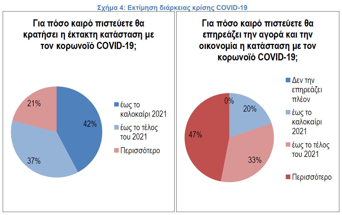 Αυτό εξηγείται και από τις εκτιμήσεις των στελεχών του κλάδου για τη διάρκεια της κρίσης, όπως φαίνεται στο σχήμα 4. Το 58% πιστεύει ότι η έκτακτη κατάσταση με τον COVID-19 θα διαρκέσει τουλάχιστον ως το τέλος του 2021, ενώ το 80% πιστεύει ότι η αγορά και η οικονομία θα επηρεάζονται από την έκτακτη κατάσταση έως το τέλος του 2021 ή και περισσότερο.