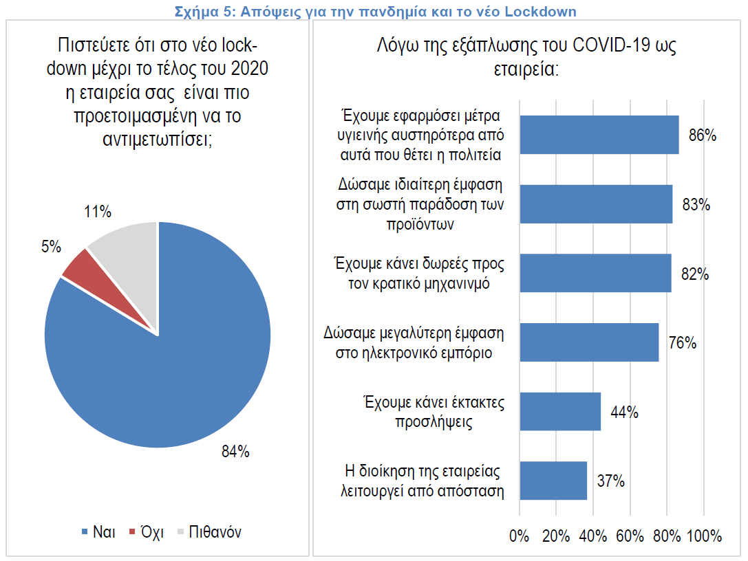 Αντίθετα, η πλειοψηφία των στελεχών σε ποσοστό 84% εκτιμά ότι οι εταιρείες είναι καλύτερα προετοιμασμένες στο νέο lockdown (σχήμα 5). Σε σχέση με τις δράσεις που έχουν αναλάβει οι εταιρείες, το 86% έχει εφαρμόσει πρωτόκολλα υγιεινής αυστηρότερα από αυτά που θέτει η πολιτεία, το 83% έχει δώσει ιδιαίτερη έμφαση στη σωστή παράδοση των προϊόντων και το 76% στο ηλεκτρονικό εμπόριο συγκεκριμένα, το 82% έχει κάνει κάποιου τύπου δωρεάς προς τον κρατικό μηχανισμό. Σε σχέση με τους ανθρώπινους πόρους το 44% έχει κάνει έκτακτες προσλήψεις (σημειώνεται ότι μόνο στο οργανωμένο λιανεμπόριο έχουν γίνει πάνω από 7.000 προσλήψεις), ενώ το για το 37% η διοίκηση της εταιρείας λειτουργεί από απόσταση.