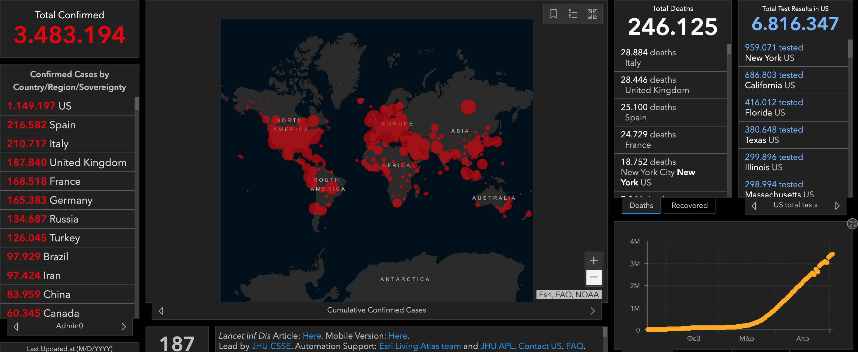 Περισσότερα από 3.479.220 κρούσματα έχουν επισήμως καταγραφεί σε 195 χώρες και εδάφη από την έναρξη της επιδημίας. Μεταξύ αυτών, τουλάχιστον 1.063.600 άνθρωποι θεωρούνται σήμερα αποθεραπευθέντες. Από την καταμέτρηση χθες στις 22.00 ώρα Ελλάδας, 3.893 νέοι θάνατοι και 80.626 νέα κρούσματα έχουν καταγραφεί παγκοσμίως. Οι χώρες που καταμετρούν τους περισσότερους νέους θανάτους είναι οι ΗΠΑ με 1.510, η Βραζιλία (421) και η Βρετανία (315).