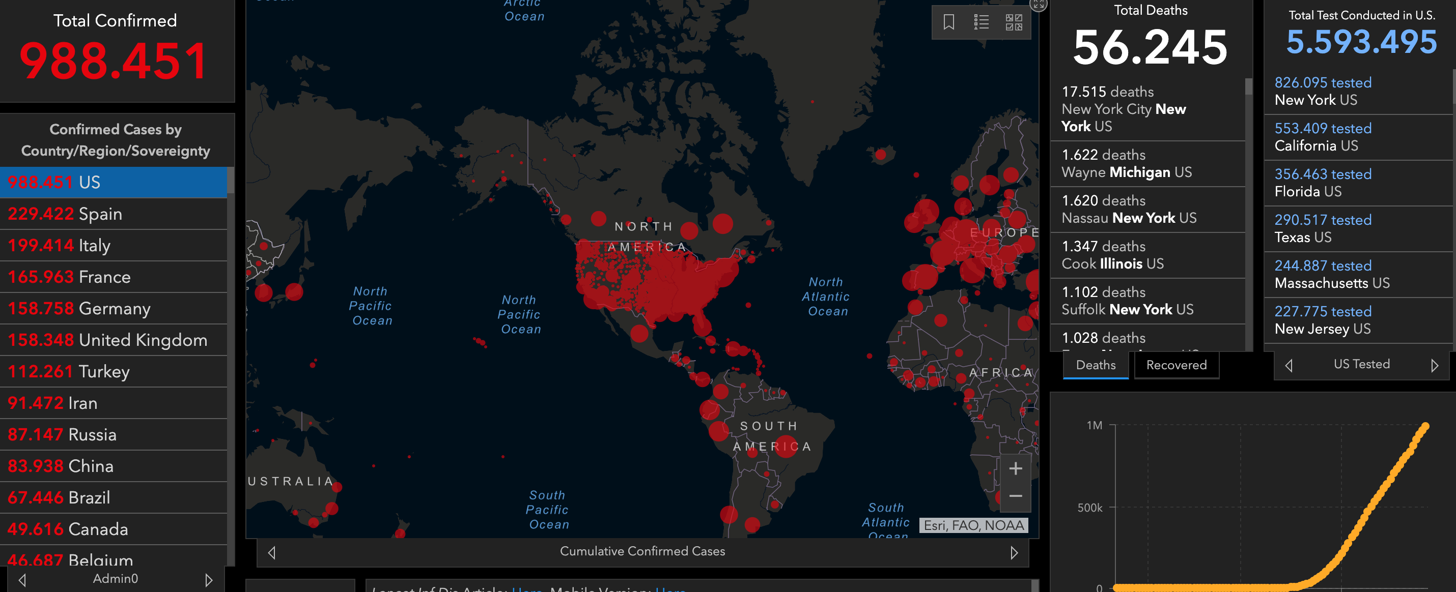 Στις ΗΠΑ καταγράφονται σχεδόν ένα εκατομμύριο κρούσματα μόλυνσης από τον SARS-CoV-2 και 56.000 θάνατοι εξαιτίας της COVID-19, ενώ η οικονομία υφίσταται βαρύ πλήγμα εξαιτίας των μέτρων που επιβλήθηκαν για την αποτροπή της εξάπλωσης της πανδημίας.