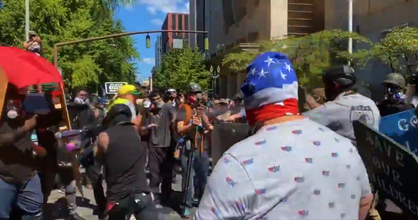 Νωρίτερα το Σάββατο σημειώθηκαν συμπλοκές στο κέντρο του Πόρτλαντ μεταξύ αντιρατσιστών και ακροδεξιών διαδηλωτών. Σε βίντεο που αναρτήθηκαν σε ιστοτόπους κοινωνικής δικτύωσης διακρίνονται οι διαδηλωτές, κάποιοι εκ των οποίων φορούν κράνη και προστατευτικά σώματος, να γρονθοκοπούνται και να ψεκάζουν με σπρέι πιπεριού οι μεν τους δε ενώ οι αστυνομικοί κατά κύριο παρακολουθούν χωρίς να επεμβαίνουν.