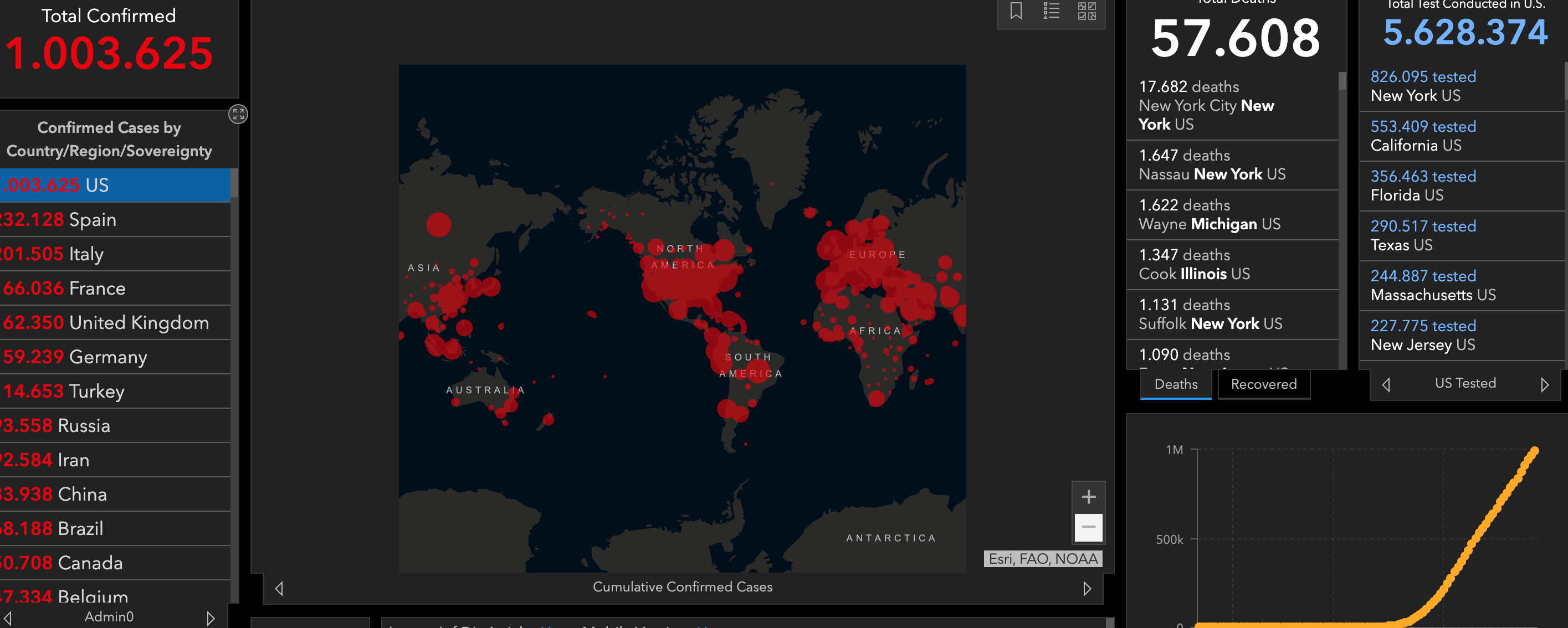 Οι Ηνωμένες Πολιτείες είναι, ήδη από τα τέλη Μαρτίου, η χώρα που μετρά τα περισσότερα κρούσματα μόλυνσης από τον ιό. Είχαν φτάσει τα 500.000 επιβεβαιωμένα κρούσματα πριν από σχεδόν τρεις εβδομάδες, στις 10 Απριλίου. Η χώρα έχει επίσης τον μεγαλύτερο αριθμό θυμάτων της Covid-19, με περισσότερους από 57.200 θανάτους να συνδέονται με την ασθένεια. Το επίκεντρο της αμερικανικής επιδημίας βρίσκεται στη Νέα Υόρκη, η Πολιτεία καταγράφει μόνη της σχεδόν το ένα τρίτο των δηλωμένων κρουσμάτων σε εθνικό επίπεδο. Μετά τις Ηνωμένες Πολιτείες, η δεύτερη χώρα με τα περισσότερα κρούσματα είναι η Ισπανία με περισσότερους από 210.000 ασθενείς με κορονοϊό, και ακολουθούν η Ιταλία και η Γαλλία.