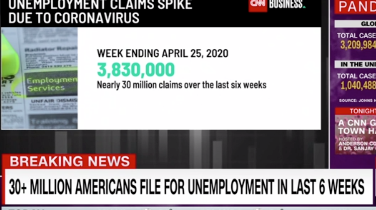 Το ποσοστό της ανεργίας τον Απρίλιο, που θα δημοσιοποιηθεί επίσημα μεθαύριο Παρασκευή, αναμένεται ότι θα πλησιάσει το 20%, θα είναι δηλαδή διπλάσιο από αυτό που γνώρισε η χώρα τη χειρότερη περίοδο της οικονομικής κρίσης του 2009, και περίπου όμοιο με το επίπεδο της Μεγάλης Ύφεσης, τη δεκαετία του 1930. Ορισμένοι οικονομολόγοι εκτιμούν πως οι θέσεις εργασίας που χάθηκαν ανέρχονται σε 28 εκατομμύρια. Συγκριτικά, 8,6 εκατομμύρια θέσεις εργασίας χάθηκαν τα δύο χρόνια που η διεθνής χρηματοοικονομική κρίση σάρωνε τις ΗΠΑ.