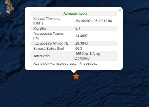 Ισχυρός σεισμός 6,1 Ρίχτερ σημειώθηκε, το πρωί της Τρίτης, σε θαλάσσια περιοχή ανοιχτά της Καρπάθου.