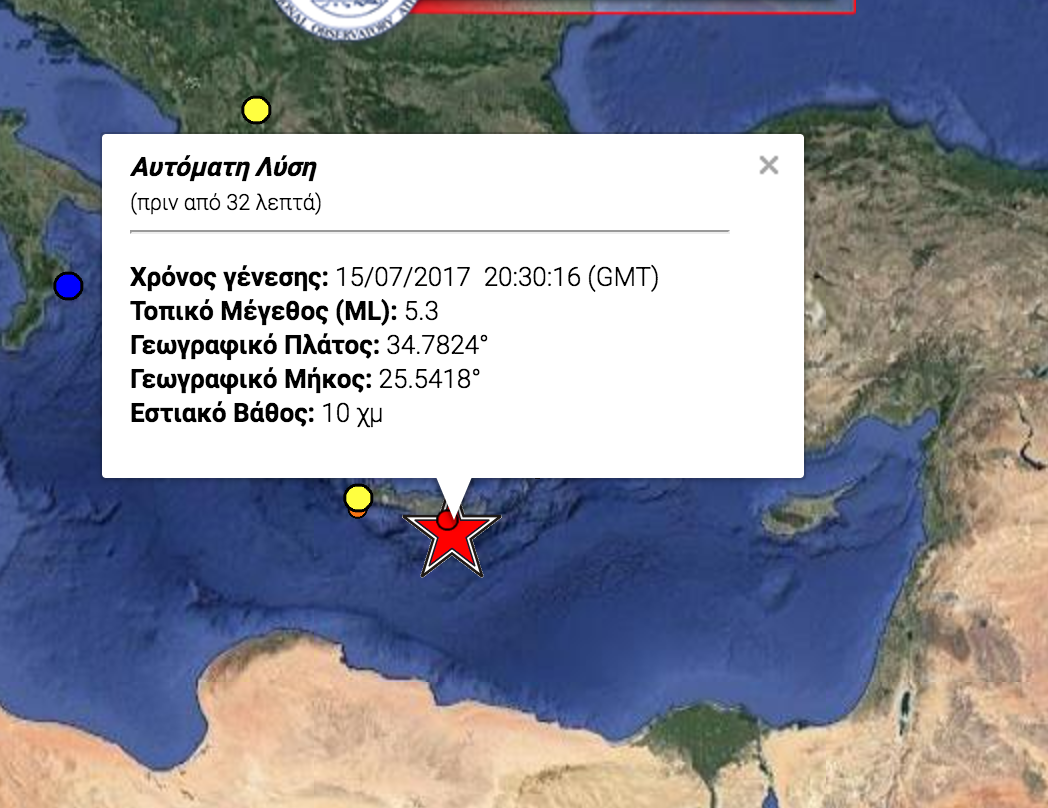Σε απόσταση 33 χιλιομέτρων από την πόλη της Ιεράπετρας, εντοπίζεται το επίκεντρο του σεισμού, που σημειώθηκε στις 23.30. Στην επίσημη ανακοίνωση του Γεωδυναμικού Ινστιτούτου αναφέρονται τα εξής: «Εκ μέρους των τεσσάρων φορέων συγκρότησης του Εθνικού Σεισμολογικού Δικτύου, το Γεωδυναμικό Ινστιτούτο του Εθνικού Αστεροσκοπείου Αθηνών ανακοινώνει ότι σήμερα (σ.σ. χθες) στις 23:30 ώρα Ελλάδος, οι σεισμογράφοι τους κατέγραψαν ισχυρή σεισμική δόνηση, με μέγεθος 5,3 βαθμών της κλίμακας Ρίχτερ, που προέρχεται από απόσταση 377 χιλιομέτρων νότια-νοτιανατολικά της Αθήνας. Το επίκεντρο της δόνησης εντοπίζεται στο θαλάσσιο χώρο 33χιλιόμετρα δυτικά -νοτιοδυτικά της Ιεράπετρας».