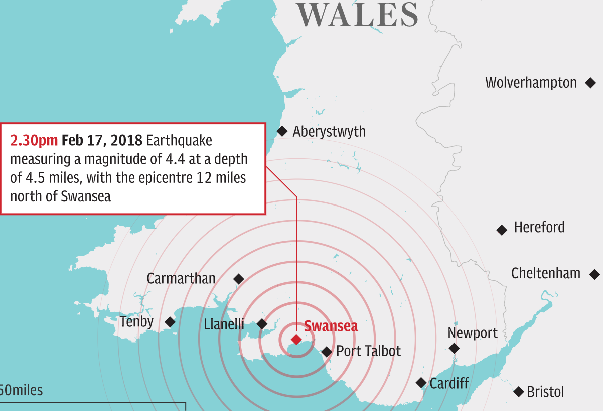 Σύμφωνα με το BGS, το επίκεντρο του σεισμού εντοπίστηκε 20 χιλιόμετρα βόρεια της πόλης Σουόνσι, στην Ουαλία. Στην ανακοίνωση των σεισμολόγων επισημαίνεται ότι είναι η σφοδρότερη σεισμική δόνηση στη Βρετανία από το 2008.