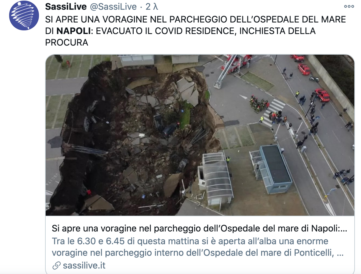 SI APRE UNA VORAGINE NEL PARCHEGGIO DELL’OSPEDALE DEL MARE DI NAPOLI: EVACUATO IL COVID RESIDENCE, INCHIESTA DELLA PROCURAhttps://t.co/WSq5bfvId5