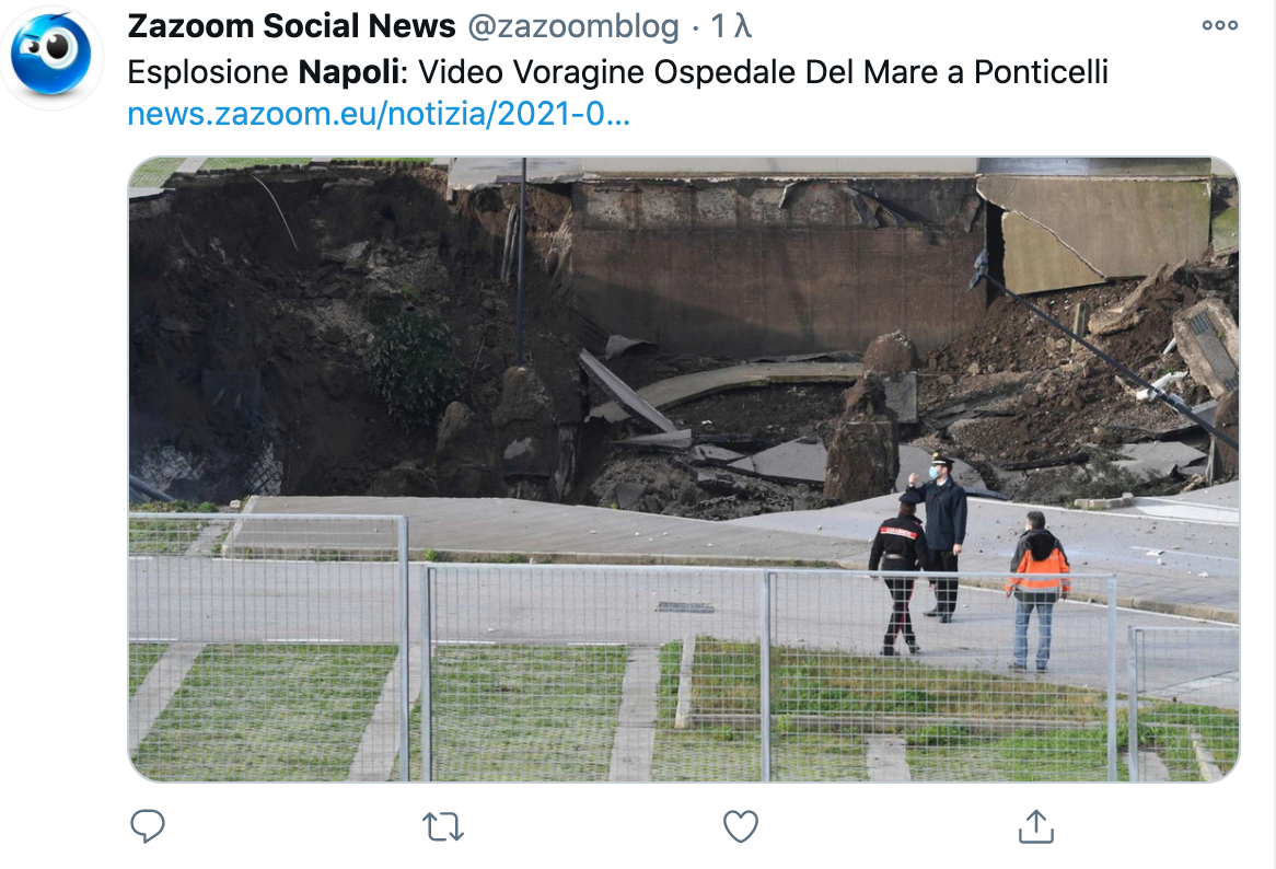 Σήμερα το πρωί ένας τεράστιος κρατήρας άνοιξε στο πάρκινγκ επισκεπτών του Νοσοκομείου Del Mare στα Ανατολικά προάστια τις Napoli. Η δημιουργία του κρατήρα προκλήθηκε από ισχυρή έκρηξη, πράγμα που φαίνεται να συνδέεται με βλάβη σε σωλήνες στο σύστημα διανομής οξυγόνου και όχι σε τρομοκρατική ενέργεια.