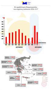 Επιπλέον, ρεκόρ υψηλών θερμοκρασιών από την έναρξη λειτουργίας τους σημειώθηκαν σε 9 μετεωρολογικούς μας σταθμούς: Βατερή-Λίμνη Ευβοίας 43,0°C, Αυλίδα 43,0°C, Χαλκίδα 42,9°C, Πλατανιάς 42,9°C, Αλικιανός 42,5°C, Χανιά 42,6°C, Άγ. Πάντες Χανίων 42,2°C, Φράγμα Ποταμών Ρεθύμνου 41,8°C, και Βαγιωνιά Ηρακλείου 41,8°C.