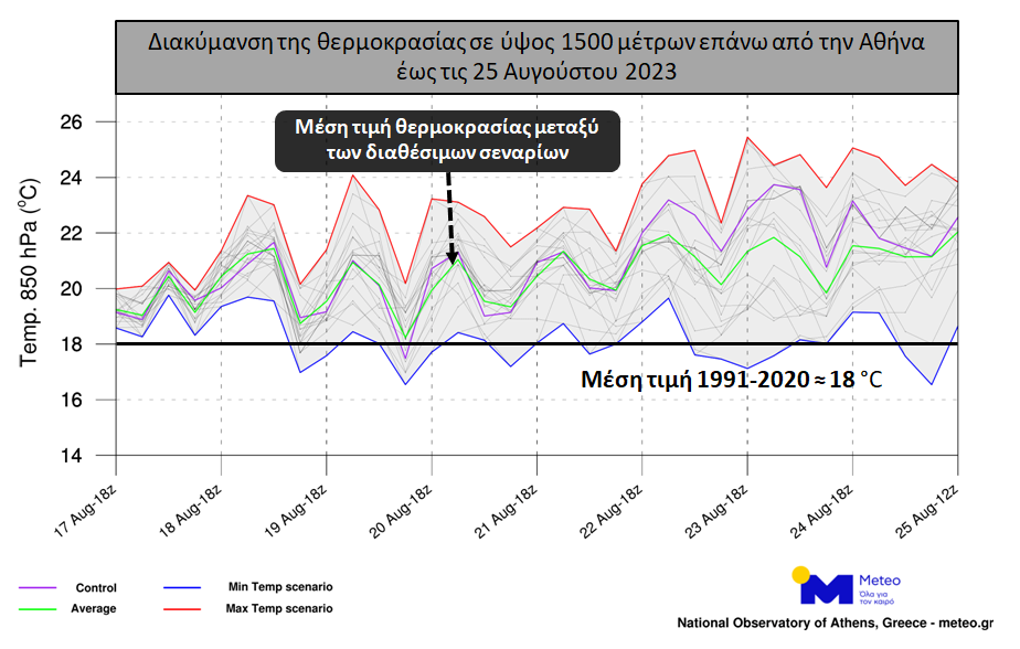 Αιτία θα είναι η εμμονή θερμών αερίων μαζών επάνω από την Ανατολική Μεσόγειο σε συνδυασμό με την απουσία σημαντικών φαινομένων. Όπως προκύπτει από τα διαθέσιμα δεδομένα οι εν λόγω αέριες μάζες θα είναι 2 έως 5 °C θερμότερες των κανονικών για την εποχή. Στην εικόνα που ακολουθεί παρουσιάζεται ενδεικτικά το εύρος διακύμανσης της θερμοκρασίας έως τις 25/08 σε ύψος 1500 περίπου μέτρων επάνω από την Αθήνα.