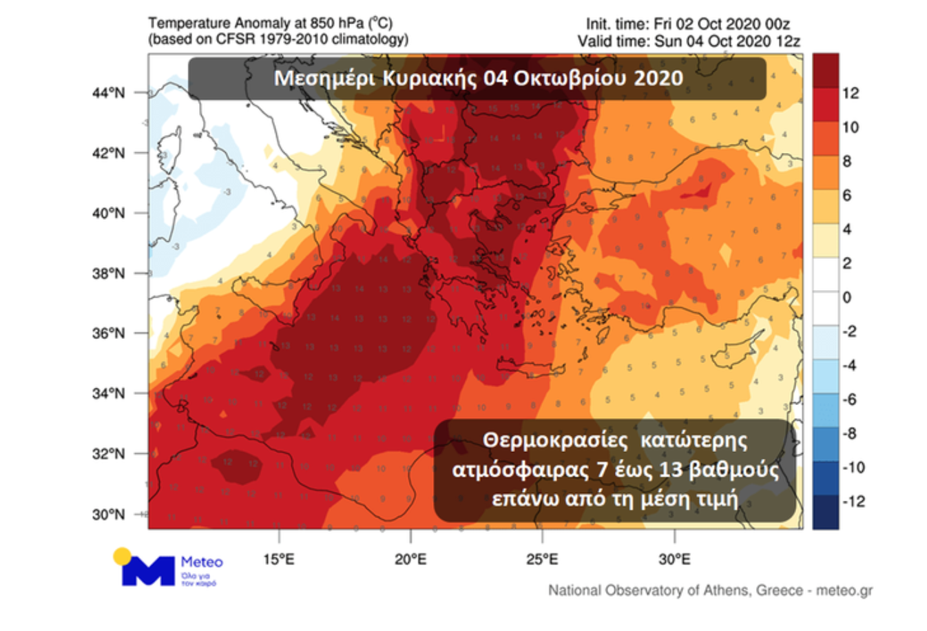 Υψηλές για την εποχή θερμοκρασίες αναμένονται από το Σάββατο 03/10 έως την Τρίτη 06/10. Σύμφωνα με τα τελευταία διαθέσιμα προγνωστικά δεδομένα του Εθνικού Αστεροσκοπείου Αθηνών / meteo.gr, την Κυριακή 04/10 και τη Δευτέρα 05/10 οι θερμοκρασίες στην κατώτερη ατμόσφαιρα επάνω από όλη τη χώρα θα είναι 7 έως 13 βαθμούς υψηλότερες από τη μέση τιμή των ετών 1979-2010.
