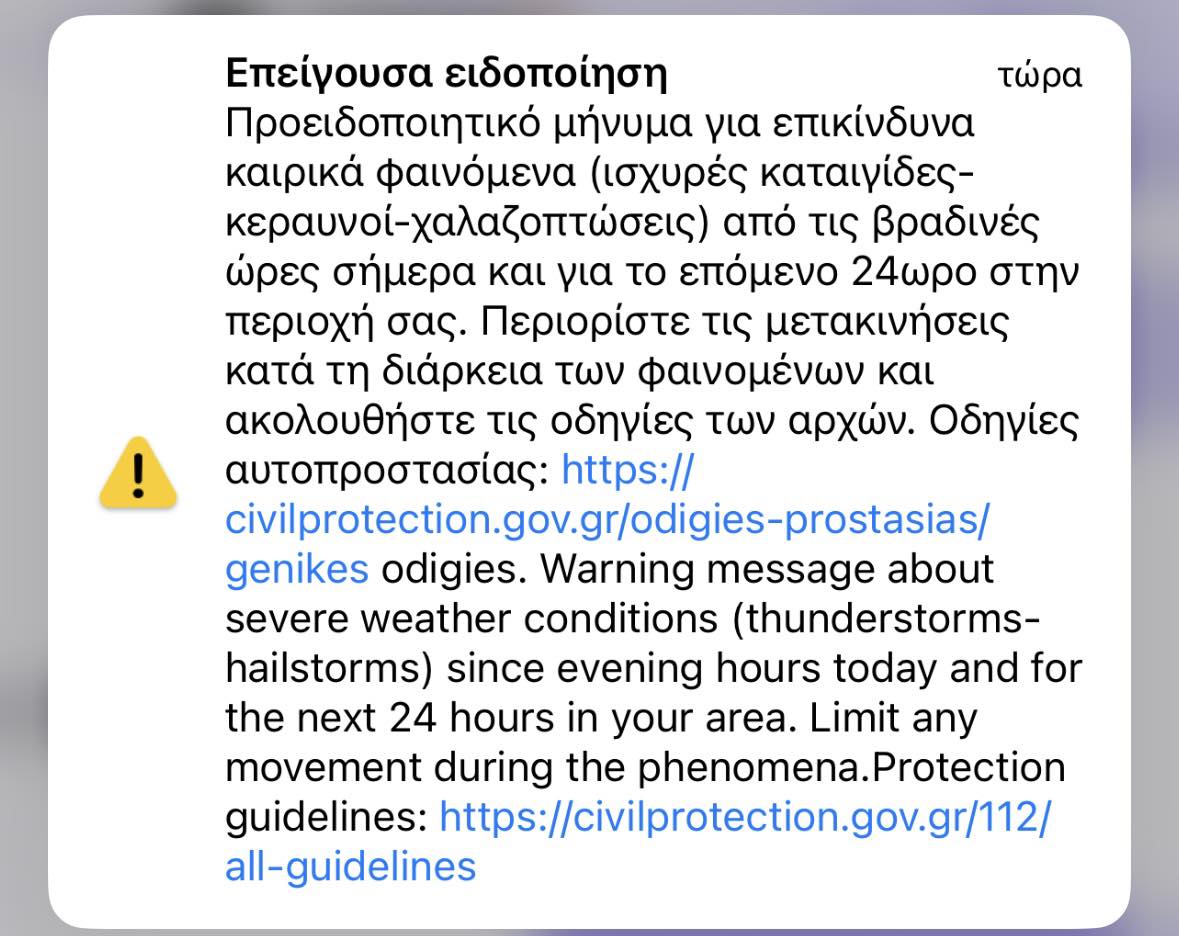Επίσης προειδοποιητικό μήνυμα για επικίνδυνα καιρικά φαινόμενα από σήμερα το βράδυ και για την Τρίτη ήχησε από το 112 στη Θεσσαλονίκη το απόγευμα της Δευτέρας.