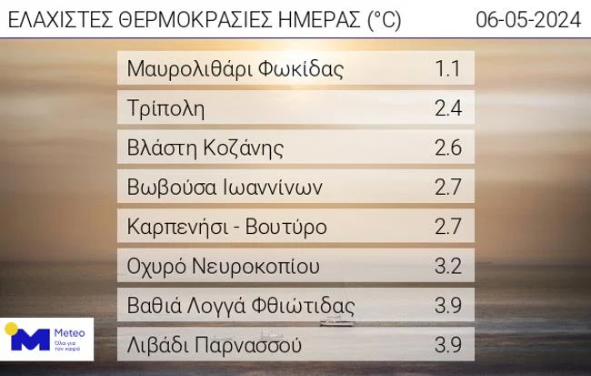 Πιο συγκεκριμένα, η ελάχιστη θερμοκρασία σημειώθηκε στο μετεωρολογικό σταθμό στο Μαυρολιθάρι Φωκίδας και ήταν ίση με 1.1 βαθμούς Κελσίου.