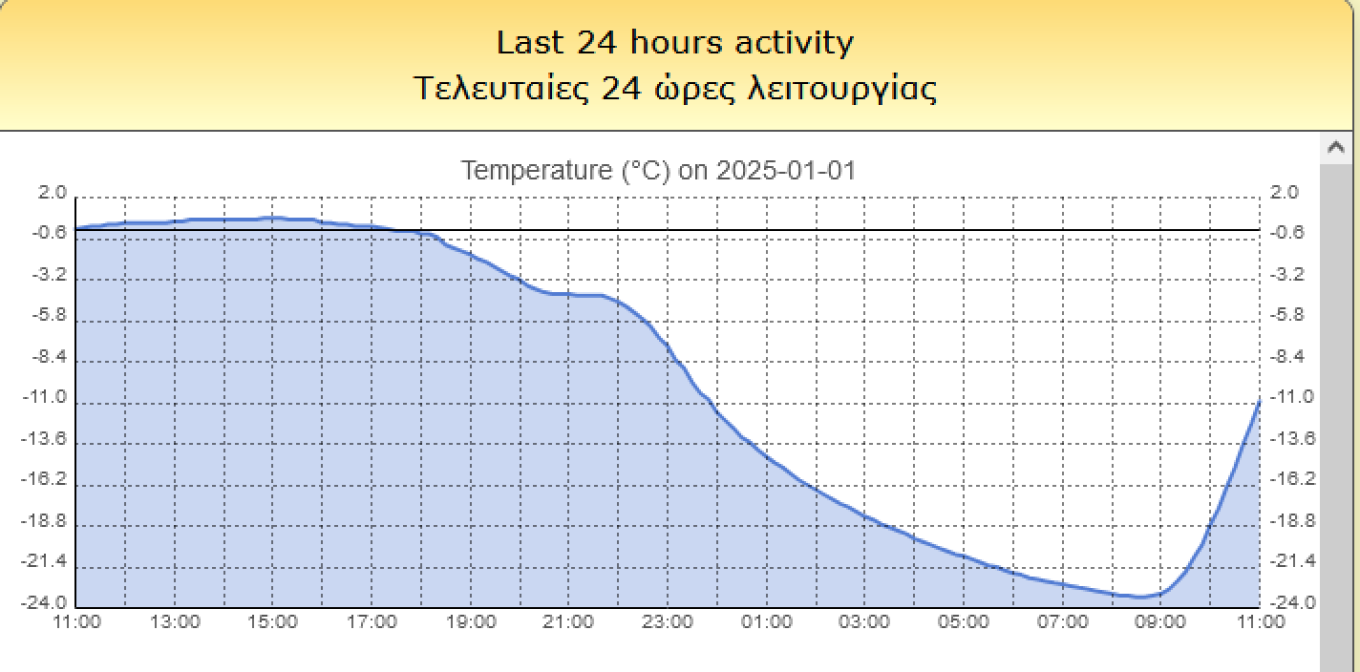 Με μια ομολογουμένως εντυπωσιακή θερμοκρασιακή διαφορά έγινε το ποδαρικό του 2025 καθώς, σύμφωνα με τα στοιχεία του Εθνικού Αστεροσκοπείου Αθηνών, ενώ στα Χανιά τα θερμόμετρα έδειχναν 19 βαθμούς Κελσίου, στο Σέσι Παρνασσού έδειχναν -23 βαθμούς Κελσίου.