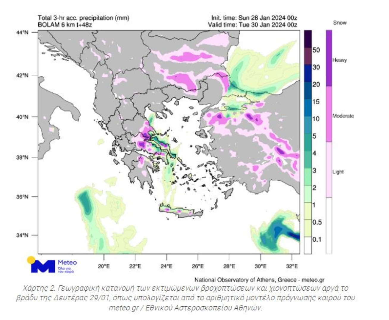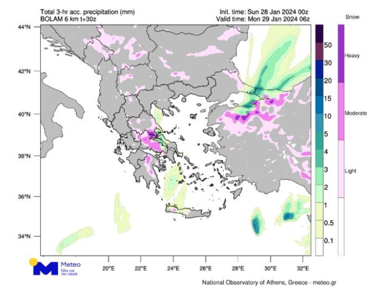 Στους προγνωστικούς χάρτες που ακολουθούν παρουσιάζεται η γεωγραφική κατανομή των φαινομένων (βροχοπτώσεις με μπλε αποχρώσεις – χιονοπτώσεις με ροζ αποχρώσεις) τις πρωινές ώρες και αργά το βράδυ της Δευτέρας 29/01.