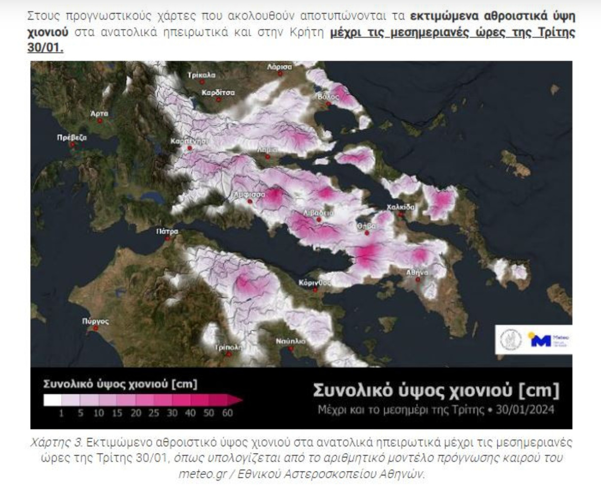 - τις τοπικά πυκνές χιονοπτώσεις σε ορεινά και ημιορεινά τμήματα της ανατολικής και νότιας χώρας, καθώς και σε περιοχές με χαμηλότερο υψόμετρο στα ανατολικά ηπειρωτικά, στην Εύβοια και στις Σποράδες