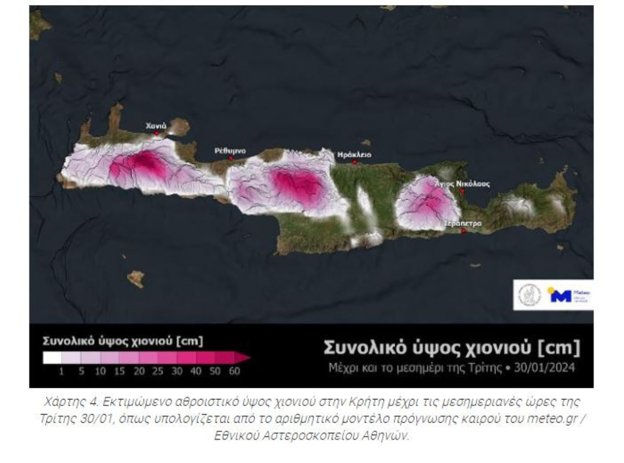 - τις βροχές και τις καταιγίδες κυρίως στο Νότιο Αιγαίο και ιδιαίτερα στην Κρήτη όπου αναμένονται πολύ μεγάλα ύψη βροχής στα πεδινά και μεγάλα ύψη χιονιού στα ορεινά-ημιορεινά