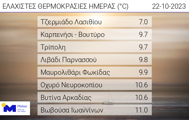 Στον παρακάτω πίνακα φαίνονται οι 8 περιοχές με τις χαμηλότερες θερμοκρασίες που δημοσιεύει το Meteo.