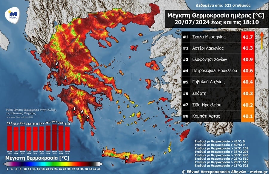 Σύμφωνα με το meteo, η μέγιστη θερμοκρασία το Σάββατο σημειώθηκε στη Σκάλα Λακωνίας με 41,7 βαθμούς Κελσίου ενώ ακολούθησε το Αστέρι Λακωνίας με 41,3 βαθμούς Κελσίου,