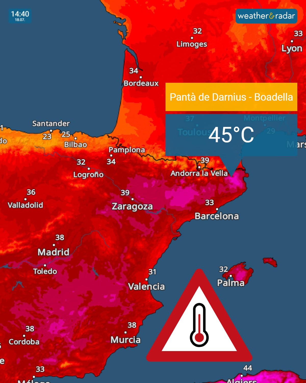 Σύμφωνα με την Ισπανική Μετεωρολογική Υπηρεσία (Aemet), οι θερμοκρασίες θα φθάσουν τους 38°C έως 42°C σε μεγάλο τμήμα της κεντρικής Ισπανίας και τους 43°C έως 44°C στο ανατολικό τμήμα της χώρας, κυρίως στην Καταλωνία, την Αραγωνία και το αρχιπέλαγος των Βαλεαρίδων.