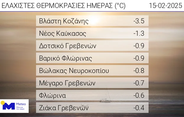Σύμφωνα με το δίκτυο αυτόματων μετεωρολογικών σταθμών του Εθνικού Αστεροσκοπείου Αθηνών / meteo.gr οι οκτώ χαμηλότερες ελάχιστες θερμοκρασίες της ημέρας, παρουσιάζονται στον παρακάτω πίνακα.