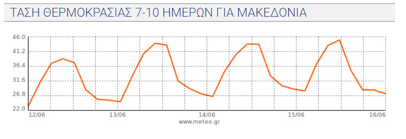 Για την περιοχή της Μακεδονίας, το meteo δείχνει τον υδράργυρο να αγγίζει μέχρι και τους 46 βαθμούς Κελσίου, στο διάστημα 12 με 16 Ιουνίου, όπως φαίνεται παρακάτω: