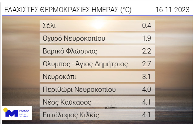 Η χαμηλότερη ελάχιστη καταγράφηκε στο Σέλι όπου ο υδράργυρος έπεσε στους 0.4 °C.