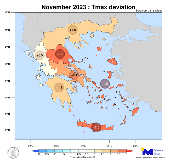 Σύμφωνα με το δίκτυο 51 μετεωρολογικών σταθμών του meteo.gr του Εθνικού Αστεροσκοπείου Αθηνών (ΕΑΑ) που λειτουργούν ανελλιπώς από το 2010 μέχρι σήμερα, τον φετινό Νοέμβριο η μέση τιμή των μεγίστων ημερήσιων θερμοκρασιών κυμάνθηκε σε ακραία υψηλά επίπεδα σχεδόν στο σύνολο της χώρας, σε σχέση με τον μέσο όρο της περιόδου 2010-2019.