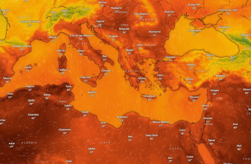 Και στην Ευρώπη αναμένεται παρόμοιο σκηνικό, προς τη Μεσόγειο, με το θερμόμετρο να δείχνει ακόμα και τους 45 βαθμούς Κελσίου.